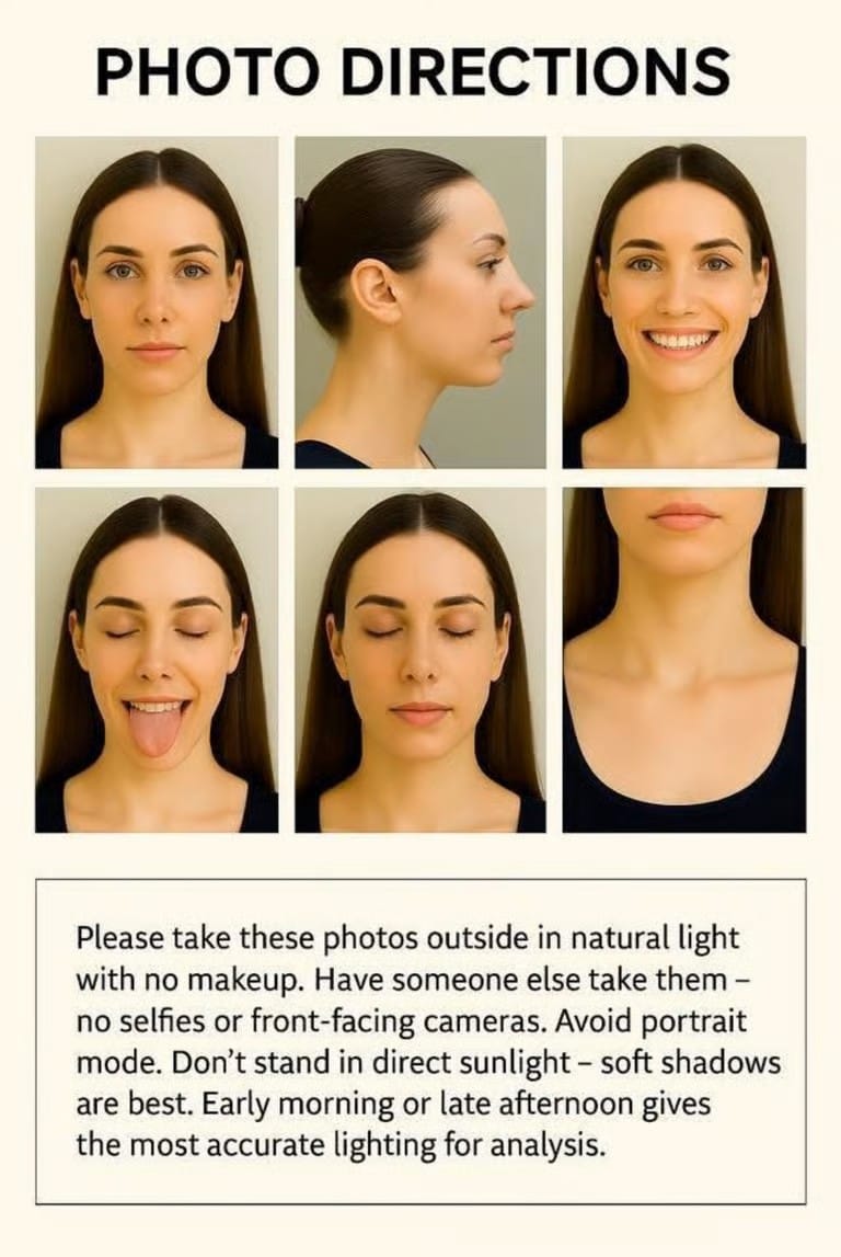 You submit your updated photos and intake. I review changes in facial and oral patterns in advance of our session.
